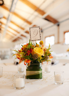 Centerpiece: Yellow Roses, orange alstromeria, solidago, craspedia, ruscus, scabiosa pods and variegated ti leaf.